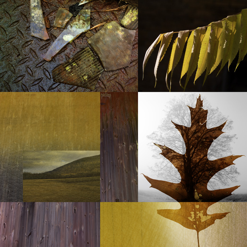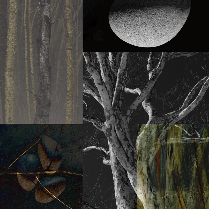 These collages are built on the four elements, earth, air, wind and water, and the four seasons as well. They have been printed on coated rice paper and mounted on supper thin and strong phenolic sheets floating a few inches off the wall.